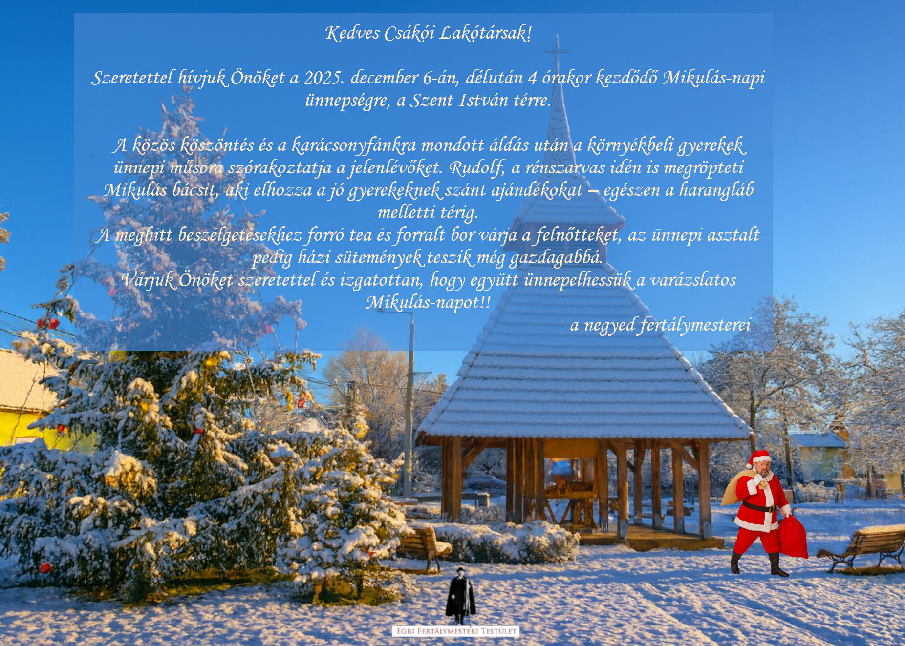 Szeretettel hívjuk Önöket a 2025. december 6-án, délután 4 órakor kezdődő Mikulás-napi ünnepségre, a Szent István térre. A közös köszöntés és a karácsonyfánkra mondott áldás után a környékbeli gyerekek ünnepi műsora szórakoztatja a jelenlévőket. Rudolf, a rénszarvas idén is megröpteti Mikulás bácsit, aki elhozza a jó gyerekeknek szánt ajándékokat – egészen a harangláb melletti térig. A meghitt […]